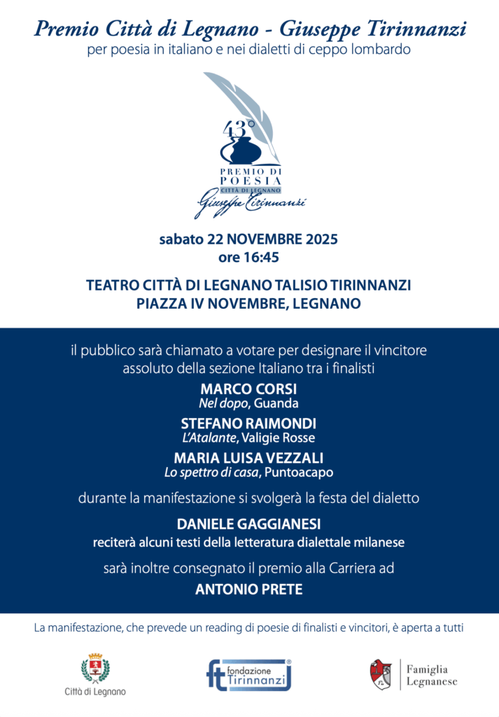 Sotto la presidenza del dr. Franco Buffoni, con la partecipazione della Famiglia Legnanese e dell’Assessorato alla Cultura di Legnano, sono stati selezionati i tre finalisti della Sezione Italiano del Premio di Poesia Nazionale. I finalisti si sottoporranno al giudizio del pubblico con votazione in diretta: