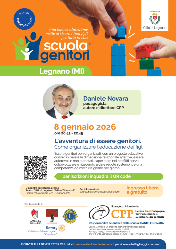 Grazie alla collaborazione tra Famiglia Legnanese, Rotary Castellanza e Lions Club Legnano Host ed al patrocinio del Comune di Legnano, anche nella nostra città sbarca la Scuola Genitori.