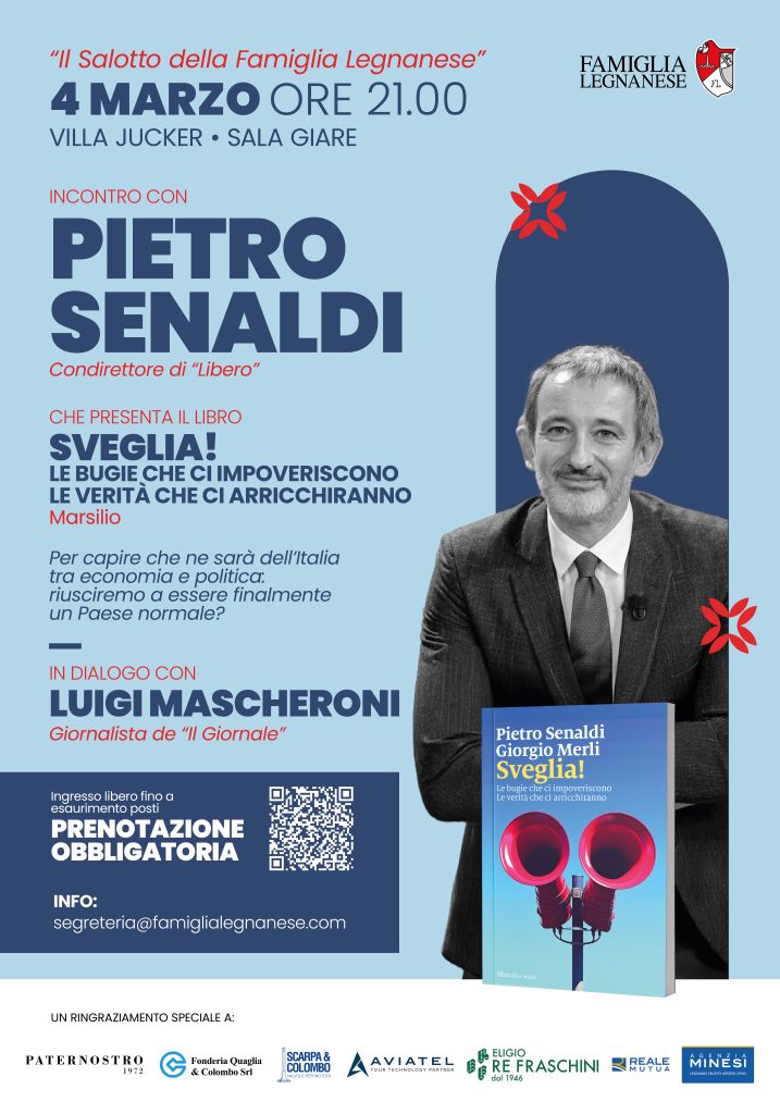 Mercoledì 4 marzo 2025 alle ore 21:00 il nostro Salotto ospiterà il giornalista Pietro Senaldi, Condirettore di “Libero”, per la presentazione del suo nuovo libro, “Sveglia! Le bugie che ci impoveriscono, le verità che ci arricchiranno” (Marsilio), scritto a quattro mani con l’esperto di strategie industriali Giorgio Merli.