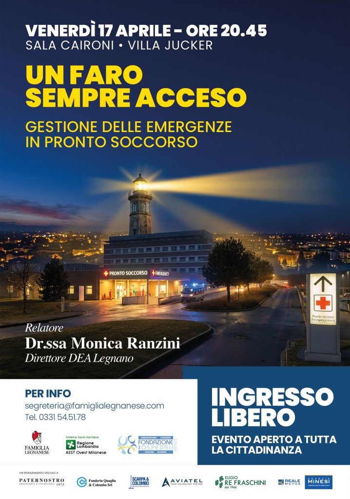 Venerdì 17 aprile alle ore 20.45, presso la Sala Caironi di Villa Jucker, si terrà l’incontro “Un faro sempre acceso. Gestione delle emergenze in Pronto Soccorso”, con la partecipazione della Dott.ssa Monica Ranzini, Direttore del DEA dell’Ospedale di Legnano.