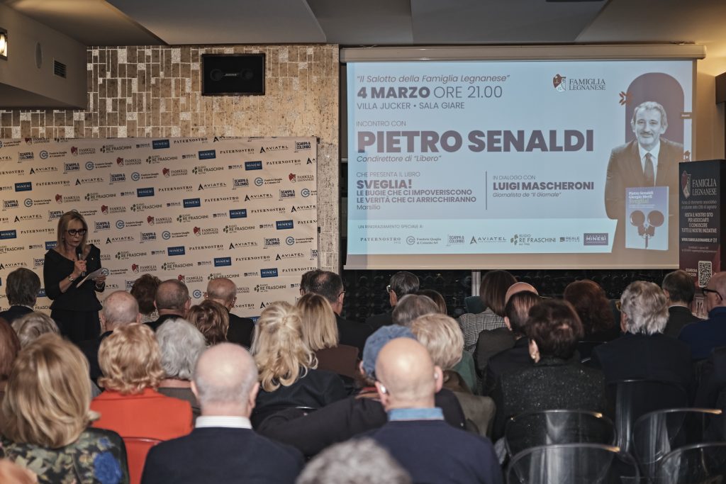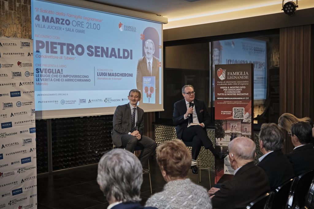 L’incontro in Famiglia Legnanese con Pietro Senaldi, condirettore di “Libero”, moderato da Luigi Mascheroni, è stato un successo: mercoledì 4 marzo in sala Giare a Villa Jucker oltre un centinaio di persone hanno partecipato alla serata organizzata dall’associazione nell’ambito del ciclo “Il Salotto della Famiglia Legnanese”. Senaldi ha presentato il suo nuovo libro, scritto in collaborazione con Giorgio Merli, dal titolo “Sveglia! Le bugie che ci impoveriscono le verità che ci arricchiranno”. Un’analisi approfondita, ricca di dati e di riflessioni, per comprendere meglio quali sono le cause dei problemi economici e politici del nostro Paese e le ricette per rilanciare concretamente l’Italia. La serata è stata introdotta da Luisella Dell’Acqua, consigliera e responsabile della Comunicazione per la Famiglia Legnanese, che ha sottolineato l’obiettivo di questi incontri, ovvero offrire serate di confronto e di approfondimento su temi di attualità.